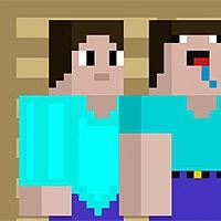 ๋‘ ํ”ฝ์…€ ์•„ํŠธ ์บ๋ฆญํ„ฐ๊ฐ€ ๋‚˜๋ฌด ๋ฐฐ๊ฒฝ ์•ž์— ์„œ ์žˆ์œผ๋ฉฐ, ํ•œ ์บ๋ฆญํ„ฐ๋Š” ์ž…์„ ๋ฒŒ๋ฆฌ๊ณ  ์นจ์„ ํ˜๋ฆฌ๊ณ  ์žˆ๋‹ค