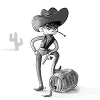 ์„œ๋ถ€ ์Šคํƒ€์ผ ๋ชจ์ž๋ฅผ ์“ด ๋งŒํ™” ์บ๋ฆญํ„ฐ๊ฐ€ ์ˆ ํ†ต ์˜†์— ์„œ ์žˆ๋Š” ํ‘๋ฐฑ ๊ทธ๋ฆผ