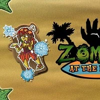 ์•ผ์ž์ˆ˜์™€ ๊ฒ€์€ ์† ๊ทธ๋ฆผ, Zombies At The Beach ๋กœ๊ณ  ์˜†์— ์–ผ์Œ์— ๊ฐ‡ํžŒ ์ข€๋น„๊ฐ€ ์žˆ๋Š” ์ด๋ฏธ์ง€
