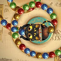 ๊ณ ๋Œ€ ์ด์ง‘ํŠธ ๋ฒฝํ™”๋ฅผ ๋ฐฐ๊ฒฝ์œผ๋กœ ํ•œ ์ƒ‰์ƒ‰์˜ ๊ตฌ์Šฌ๋“ค์ด ๋ฑ€ ๋ชจ์–‘์œผ๋กœ ๋ฐฐ์—ด๋˜์–ด ์žˆ์œผ๋ฉฐ ์ค‘์•™์— ์ž…์„ ๋ฒŒ๋ฆฐ ๊ฒ€์€ ๊ณ ์–‘์ด ์กฐ๊ฐ์ƒ์ด ์žˆ์Šต๋‹ˆ๋‹ค